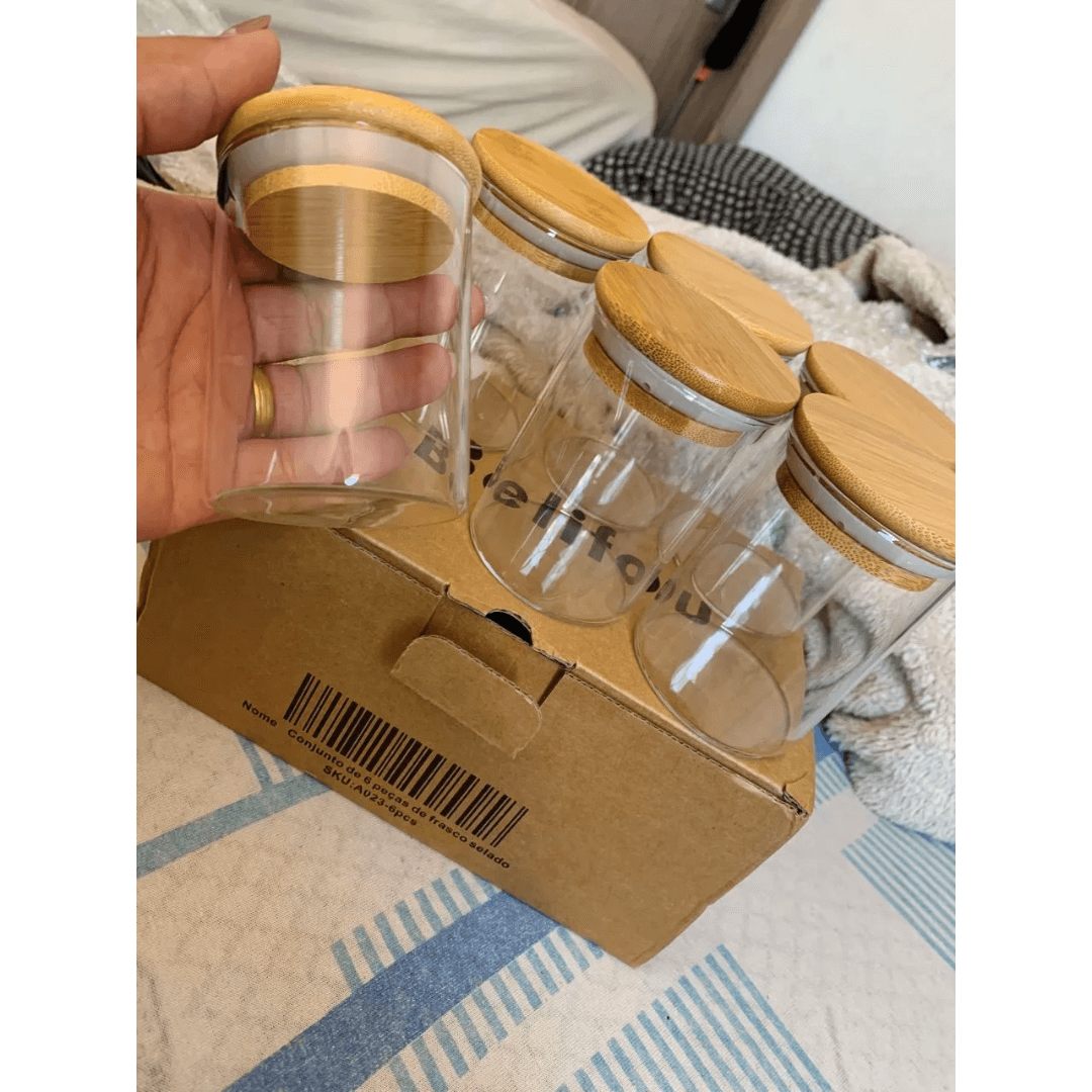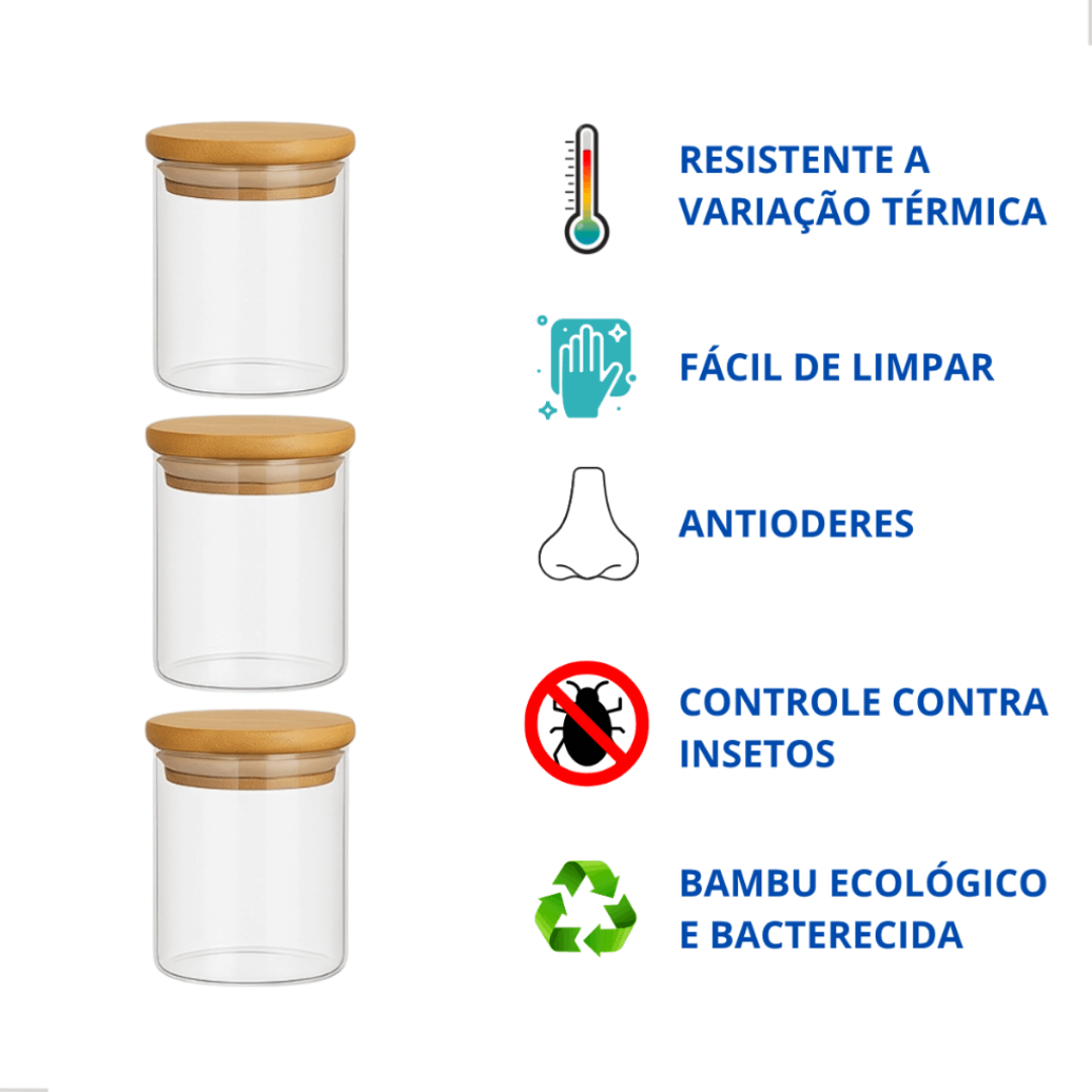 📌 Material dos potes: Vidro transparente (não retém cheiro e é fácil de limpar)